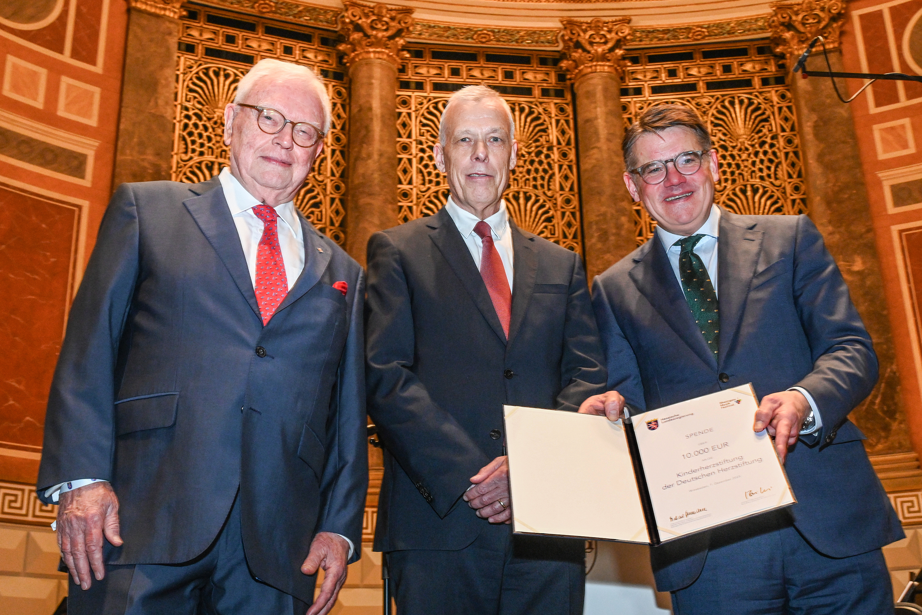 Ministerpräsident Boris Rhein hat die Arbeit der Kinderherzstiftung gelobt und als Lichtblick für betroffene Kinder bezeichnet. Beim traditionellen Weihnachtskonzert des Hessischen Ministerpräsidenten am Sonntag im Wiesbadener Kurhaus überreichten der Regierungschef und der Intendant des Rheingau-Musik-Festivals, Michael Herrmann, eine Spende von 10.000 Euro an den Vorstandsvorsitzenden des Vereins Deutsche Herzstiftung e.V., Prof. Dr. med. Thomas Voigtländer. Das Geld stammt unter anderem aus dem Verkaufserlös der rund 1.000 Karten für das Konzert.